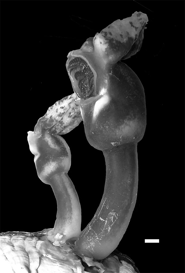 Trông như một sinh vật trong các bộ phim quái vật ngoài hành tinh nhưng thực tế sinh vật kì dị mà các bạn thấy là conchoderma auritum - hà tai thỏ. Đây là một loài thuộc lớp chân hàm trên (maxillopod) thuộc họ hà cổ ngỗng Lepadidae. Chúng xuất hiện phổ biến tại vùng biển châu Âu, châu Phi và New Zealand.