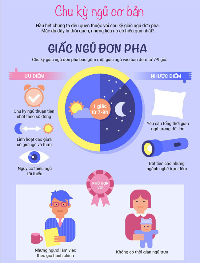 Hầu hết chúng ta đều quen thuộc với chu kỳ giấc ngủ đơn pha. Đây là chu kỳ ngủ phổ biến nhất và bao gồm một giấc ngủ chính vào ban đêm từ 7-9 giờ. Điều này phù hợp nhất với những người làm việc trong giờ hành chính hoặc lịch trình không cho phép chợp mắt vào giữa ngày.