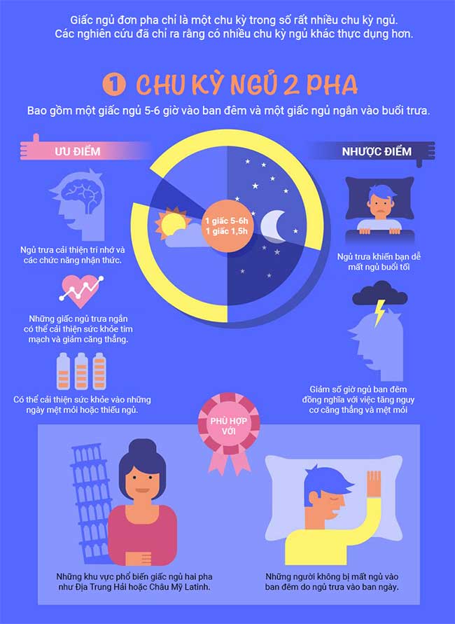Mô hình ngủ hai pha bao gồm một mô hình ngủ tách rời, vì vậy khoảng 5-6 giờ vào ban đêm và khoảng 2 giờ vào buổi trưa. Bằng cách chợp mắt vào giữa ngày giúp bạn tỉnh táo hơn vào những ngày bạn đặc biệt mệt mỏi. Ngủ trưa cũng cải thiện trí nhớ và các chức năng nhận thức và nếu được thực hiện thường xuyên, giấc ngủ trưa ngắn có thể cải thiện sức khỏe tim mạch và giảm căng thẳng.