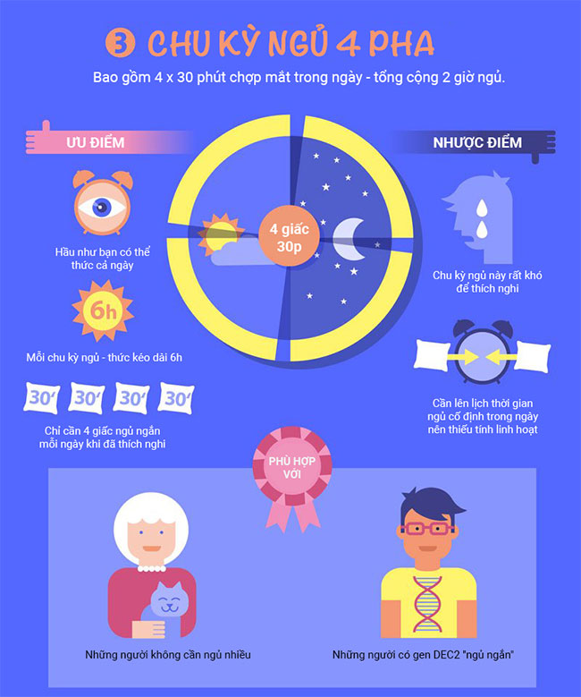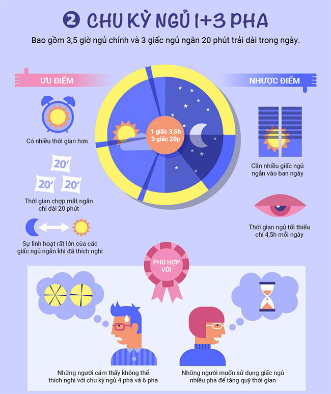 - Everyman (1+3 pha): 1 giấc ngủ 3,5 giờ vào ban đêm và 3 giấc ngủ 20 phút cách đều vào ban ngày