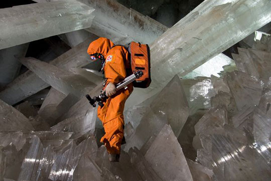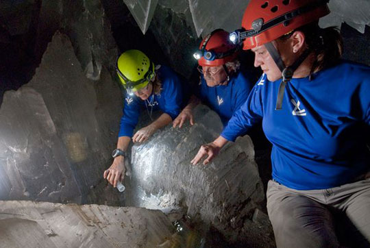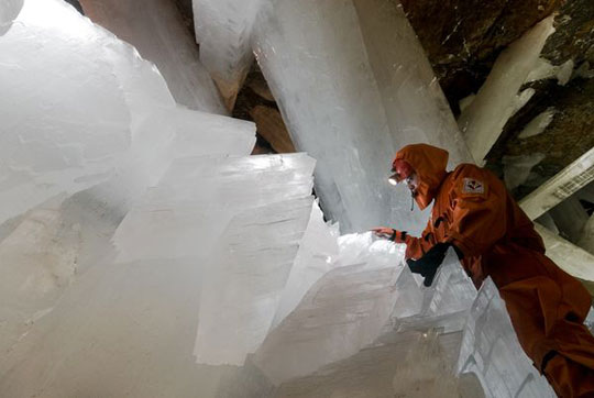 Trong những bộ quần áo màu cam được làm mát bằng nước đá, các nhà khoa học đi sâu vào trong lòng hang pha lê với độ sâu 300m dưới lòng đất.