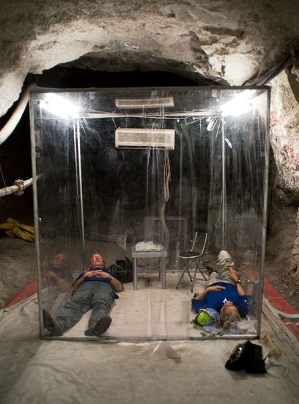 Hình ảnh một nhà thám hiểm trong phòng không khí lạnh để tránh cái nóng của hang động đẹp kì lạ này. Nhiệt độ thường xuyên lên đến trên 50 độ C cùng độ ẩm từ 90 – 100% của hang khiến cho quá trình nghiên cứu gặp rất nhiều khó khăn.