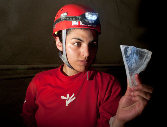 Một nhà khoa học đã xem xét một mẩu tinh thể trong hang động.