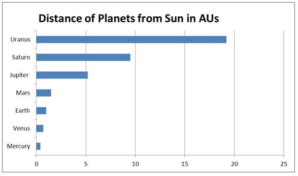 Khoảng cách từ Mặt Trời đến 7 hành tinh đầu tiên tính bằng AU, trong đó 1 AU = khoảng cách Trái Đất - Mặt Trời.