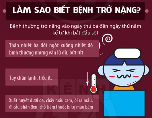 Từ ngày thứ 3 – 7 của bệnh, trẻ bắt đầu hạ sốt khoảng 37,5 – 38 độ C hoặc thấp hơn, một số bệnh nhi xuất hiện các dấu hiệu cảnh báo như lừ đừ, mệt mỏi, ói nhiều, đau bụng, xuất huyết niêm mạc, gan to, hoặc một số trường hợp diễn tiến đến sốc sốt xuất huyết với biểu hiện tay chân lạnh, mạch nhanh nhẹ, huyết áp kẹp hoặc không đo được. Tất cả những trường hợp trên cần phải được nhập viện ngay và tuân theo sự chỉ định của bác sĩ. Nếu để tình trạng sốc kéo dài, bệnh nhi có thể tổn thương nhiều cơ quan, có thể dẫn đến tử vong.