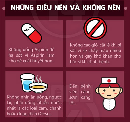 - Không dùng hạ sốt bằng Aspirin, Ibuprofen (vì dễ gây xuất huyết nặng)
