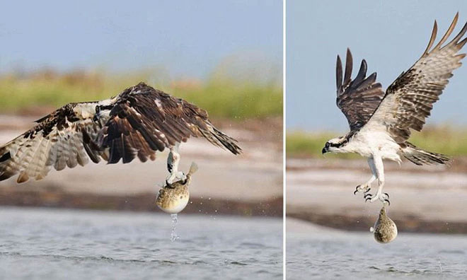 Một con cá nóc phồng người lên khi bị chim săn cá bắt được. Con chim sẵn sàng thả con mồi đi vì nó biết mình không thể nuốt trôi được.